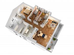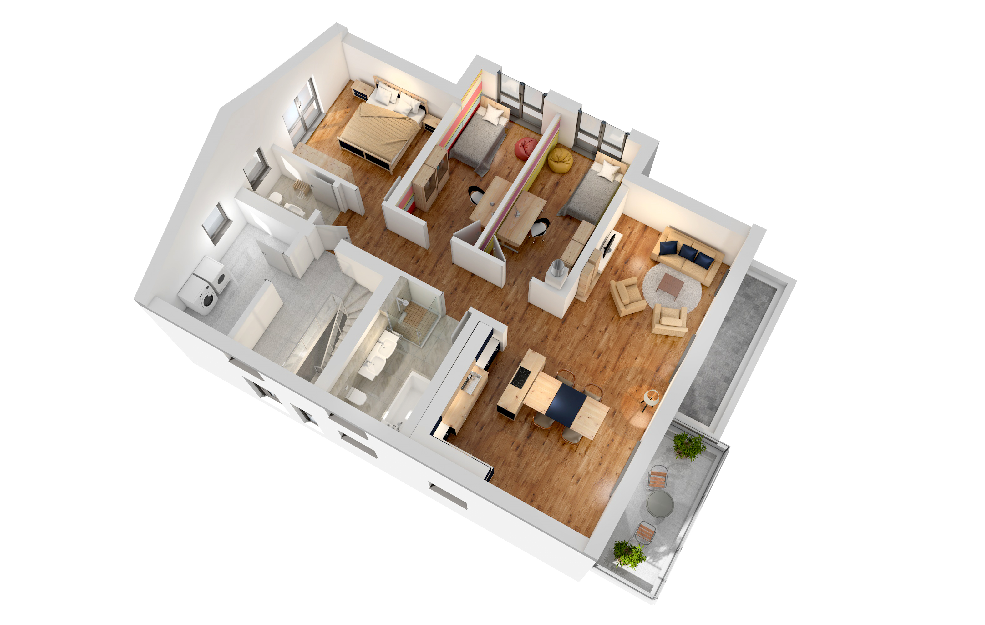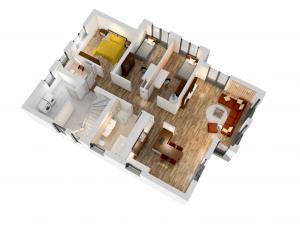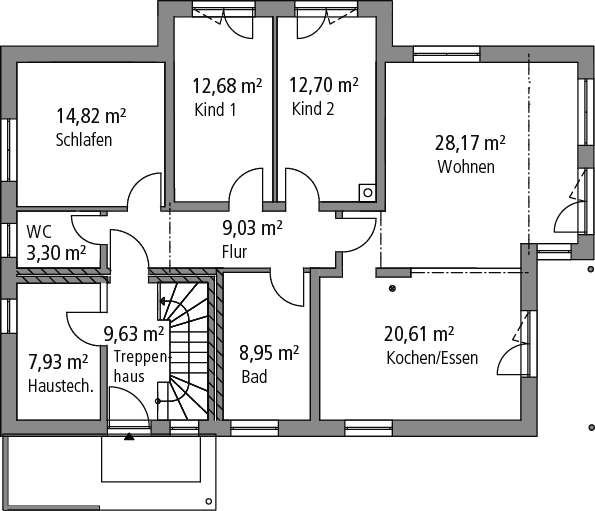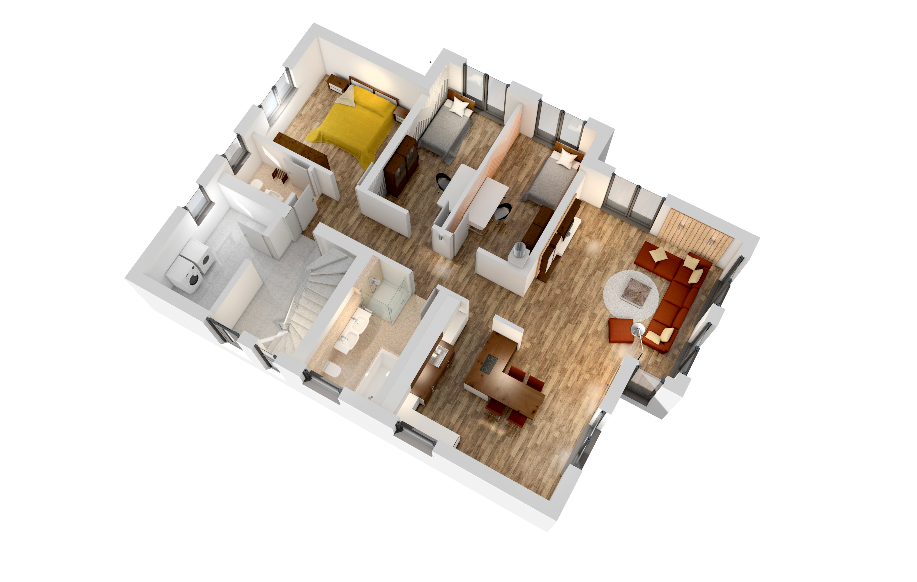 Die bodentiefen Fenster auf beiden Ebenen sorgen für helle Wohnräume und die durchdachte Raumaufteilung erlaubt ein komfortables Wohnen in zwei gleichwertigen Wohneinheiten – Tag für Tag.